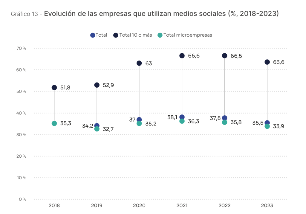 El uso de las redes sociales por parte de las empresas alcanzó su punto álgido en 2021, impulsado por la pandemia de COVID-19, que obligó a digitalizar las interacciones y las ventas en un tiempo récord. Sin embargo, los datos recientes del Informe de Digitalización de las Pymes 2024 muestran una tendencia decreciente: en 2023, solo el 35,5% de las empresas en España utilizaban redes sociales, marcando una caída sostenida desde ese pico. Este fenómeno invita a reflexionar sobre si estamos ante un desencanto temporal o un cambio más profundo en la manera en que las empresas gestionan su presencia digital.